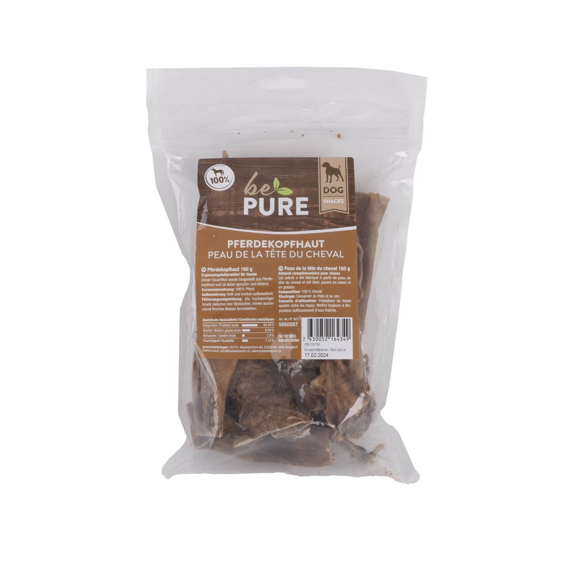 Die bePure Pferdekopfhaut ist ein toller Kauspass und sorgt für ein grosses Kauvergnügen. Die zähen Stücke erfordern einen starken und gesunden Hundekiefer. Dieser Kauartikel wurde aus Pferdekopfhaut hergestellt und ist daher geruchs- und fettarm. Verwöhne deine liebste Fellnase mit dem Kauartikel mit Pferdekopfhaut von bePure.