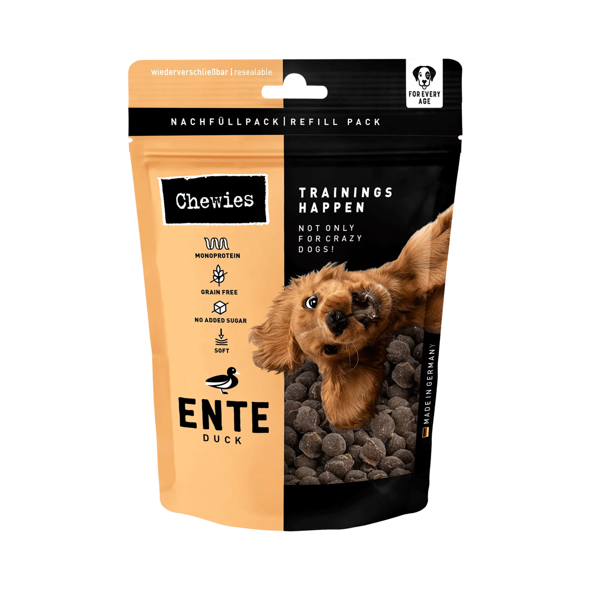 In jedem Hund wohnt ein Tänzer aus Freude, ein Abenteurer voller Neugier und ein Geniesser, der kleine Köstlichkeiten schätzt. Unsere Chewies® Trainings-Happen Ente 175g sind wie funkelnde Sterne im Alltag deines Hundes: klein, weich, köstlich – und perfekt, um Lernerfolge sanft zu begleiten. Ein Happs, und das Training fliesst weiter, ohne Ablenkung. So entstehen viele kleine Momente des Gelingens – und das ganz ohne Kalorien-Überladung.